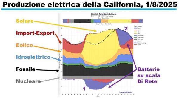 Ad Agosto 2025, in California, la quarta economia del mondo, oltre 40 GWh di batterie su scala di rete permettono di usare l’energia solare prodotta di giorno anche durante buona parte della notte. Rispetto a soli quattro anni prima (Agosto 2021), quando le batterie erano assenti, l’energia elettrica prodotta da fotovoltaico si è raddoppiata. Il nucleare è sempre più marginale, e con l’avvento del fotovoltaico e batterie sta diventando sempre più inutile.