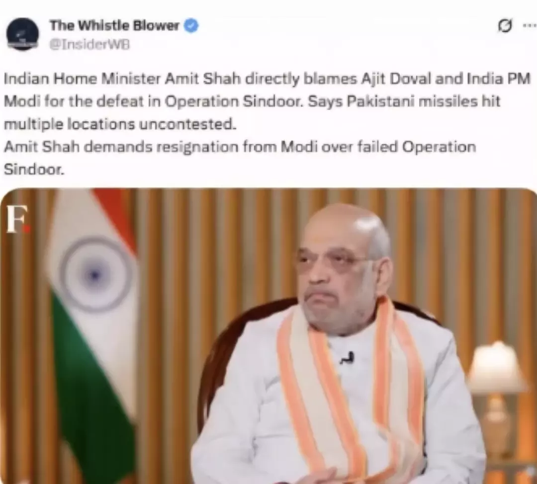 The 1.30 minutes video was posted on X by the handle 'The Whistle Blower' (@InsiderWB) with the caption, "Indian Home Minister Amit Shah directly blames Ajit Doval and India PM Modi for the defeat in Operation Sindoor. Says Pakistani missiles hit multiple locations uncontested. Amit Shah demands resignation from Modi over failed Operation Sindoor."