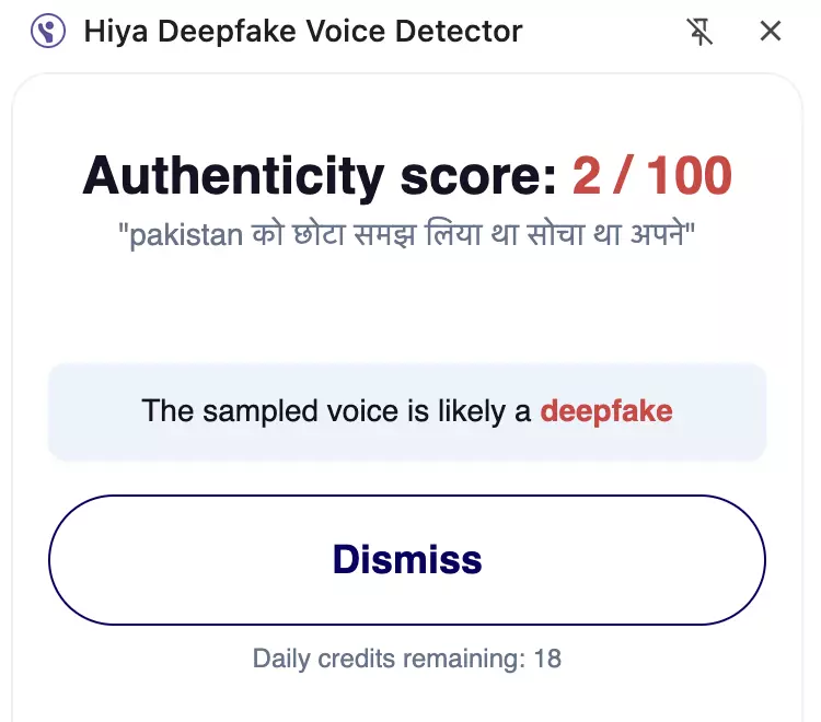 We ran the 1.30 minutes video through two AI deepfake voice detection tools: Hiya Deepfake Voice Detector and DeepFake-O-Meter by UB Media Forensics Lab. Both tools results confirmed that the voiceover of Shah in the video is overlaid onto the original footage.