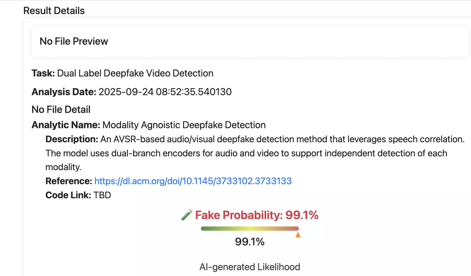 Hiya Deepfake Voice Detector gave the voice an authenticity score of 2/100, flagging it as highly likely to be a deepfake. One of the results bytest DeepFake-O-Meter gave it a fake portability of 99.1% that it is AI-generated.