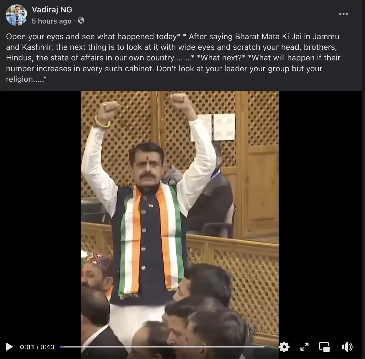 The video is being shared on social media with the catpion, "Open your eyes and see what happened today* * After saying Bharat Mata Ki Jai in Jammu and Kashmir, the next thing is to look at it with wide eyes and scratch your head, brothers, Hindus, the state of affairs in our own country........* *What next?* *What will happen if their number increases in every such cabinet. Don't look at your leader your group but your religion...*"