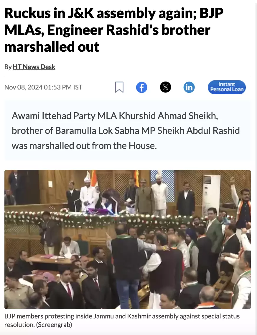 We also found several news reports on the incident on November 8, 2024, reporting that atleast 11 BJP MLAs were evicted from the House for causing disruptions while protesting the special status resolution on Article 370.