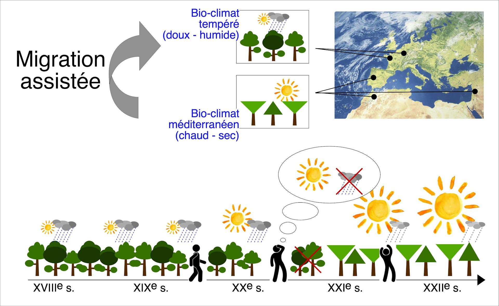 Il n’y a pas que les humains et les animaux qui migrent. Les arbres le font aussi naturellement, à une vitesse estimée à quelques kilomètres par siècle. Ainsi, via la dispersion de graines, certaines espèces ont pu migrer vers des latitudes plus clémentes, lors des grands changements climatiques passés. Mais face à la rapidité du changement climatique actuel, cette vitesse semble bien trop lente, puisqu’il faudrait que les arbres se déplacent de plusieurs centaines de kilomètres par siècle pour faire face au changement climatique. De ce constat est né le concept de migration assistée.