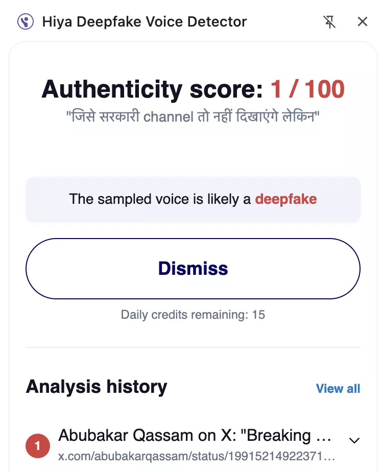 We analysed the video through two deepfake voice detection tools, Hiya Deepfake Voice Detector and DeepFake-O-Meter by the University at Buffalo’s Media Forensics Lab. Hiya Deepfake Voice Detector gave the voice an authenticity score of 1/100, flagging it as highly likely to be a deepfake.